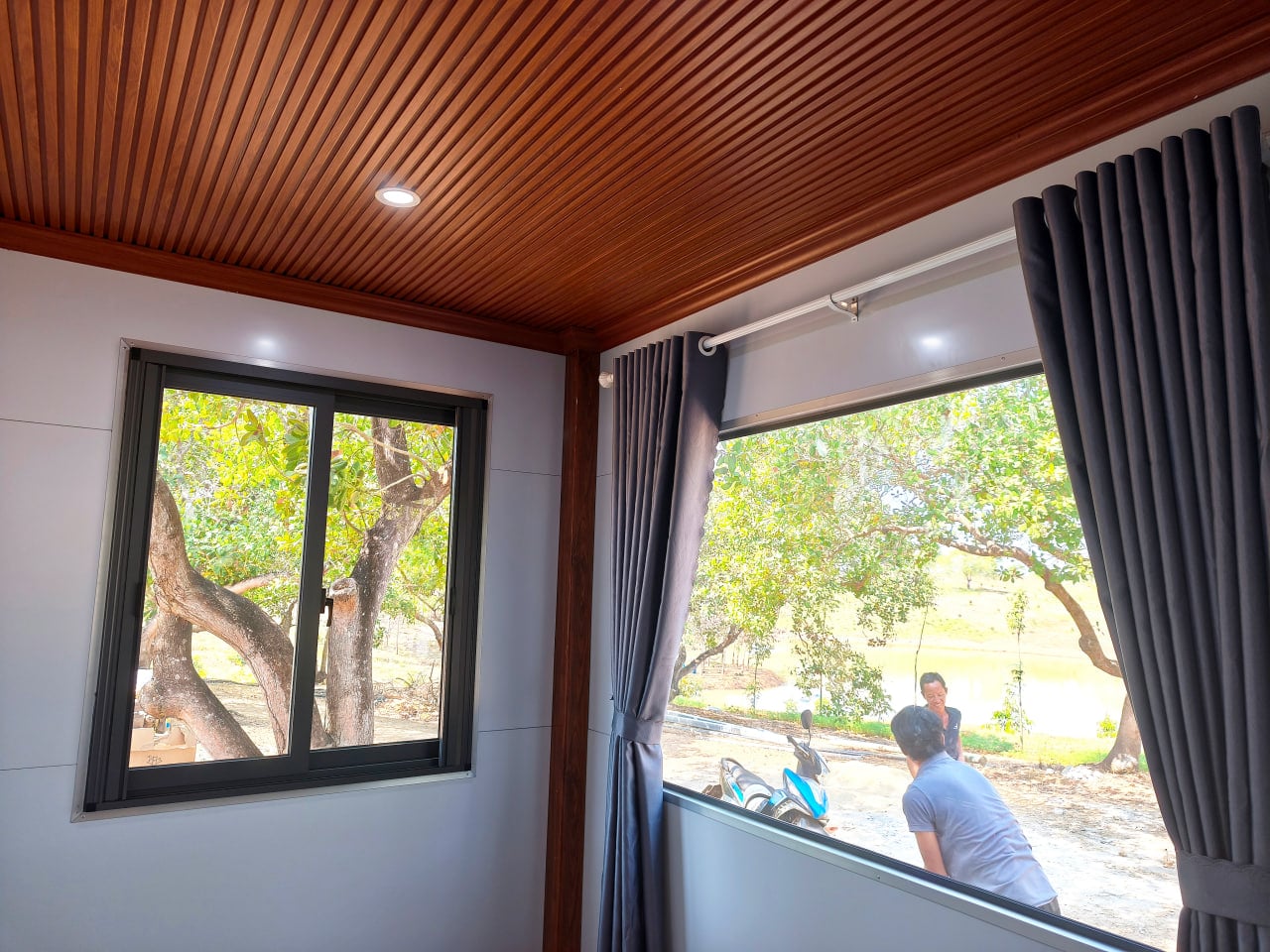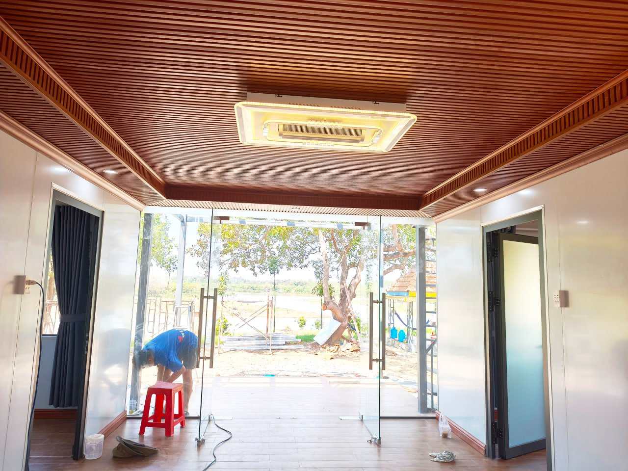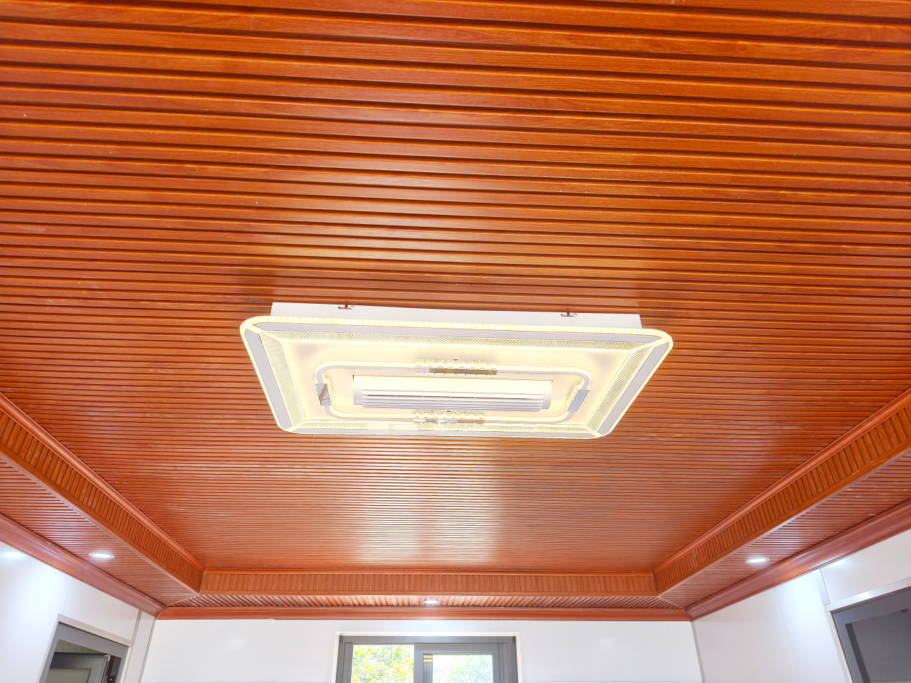 Đóng trần gỗ nhựa giật cấp cho phòng khách + bếp 24m2